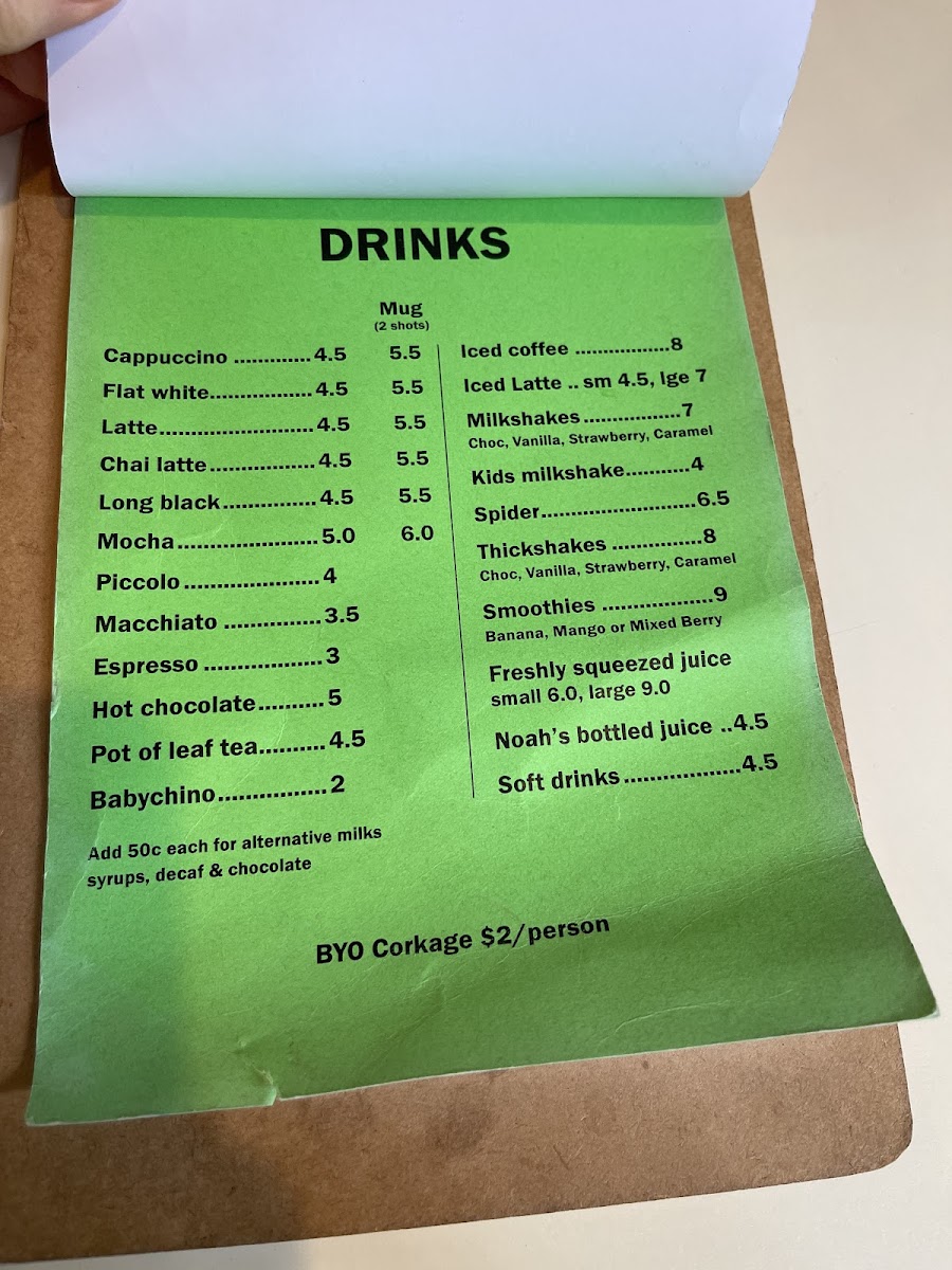 Beverage choices cover a wide range of coffee styles, including cappuccino, flat white, latte, chai latte, long black, mocha, piccolo, macchiato, and espresso. Non-coffee options include hot chocolate, pot of leaf tea, babychino, iced coffee, iced latte, milkshakes, kids’ milkshakes, thickshakes, smoothies, freshly squeezed juices, bottled juices, and soft drinks.